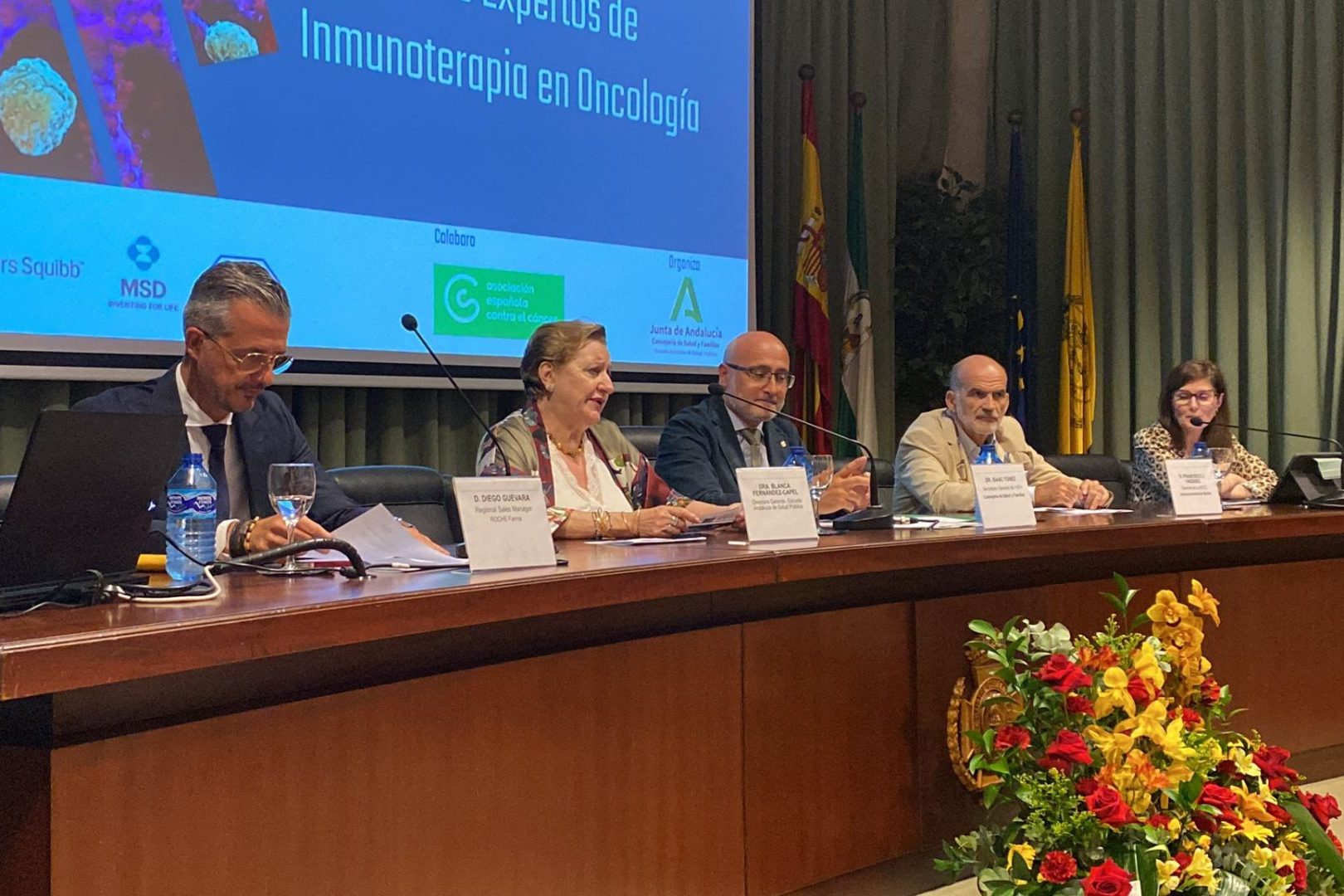 El acto de bienvenida ha estado presidido por el Secretario General de Investigación, Desarrollo e Innovación en Salud de la Consejería de Salud y Familias, Isaac Túnez, que ha estado acompañado de la directora gerente de la EASP, Blanca Fernández-Capel; Francisco José Vázquez, gerente de la Asociación Española Contra el Cáncer en Sevilla; María Amparo Valladares, directora regional de Acceso de MSD; Ernesto Cortés, gerente de Relaciones Institucionales de Bristol-Myers Squibb; y Diego Guevara, responsable del Área de Oncología de Roche Farma.