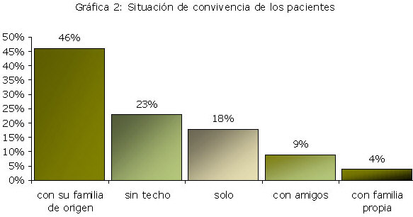 La situación de convivencia y de abrigo de los participantes, como vemos en la Gráfica 2, muestra que éstos viven en su mayoría con su familia de origen (46%). No obstante un importante porcentaje de los participantes se encuentra en situación de desabrigo (23%). Por último, viven solos un 18% de los participantes, con amigos un 9% y uno de ellos con su familia propia. La situación de los pacientes sin techo está siendo valorada por el equipo de trabajadoras sociales a fin de ser admitidos en programas de pisos de reinserción o, en los casos de enfermedad mental crónica, viviendas tuteladas por FAISEM (Fundación de Salud Mental), entre otros recursos disponibles.
