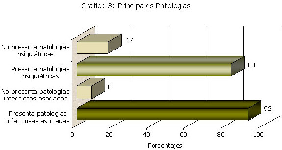 Las principales patologías que presentan los pacientes son las infecciosas y las psiquiátricas (ver gráfica 3). El 92% de los participantes muestran patologías infecciosas asociadas al uso de la vía intravenosa en condiciones sépticas, entre las que destacan (ver tabla 1) la hepatitis C (87%) y el virus de inmunodeficiencia humana (50%). No se han encontrado pruebas positivas de tuberculosis y otras enfermedades de transmisión sexual. Por último, el 83 por ciento de los participantes muestra patologías psiquiátricas.