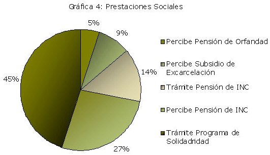 El equipo de apoyo psicosocial ha valorado la situación económica actual de los pacientes. La tramitación de pensiones y ayudas es una importante función de este equipo, propiciando así que los pacientes puedan beneficiarse de los recursos sociales existentes y a los que no han tenido acceso ya sea por falta de apoyo o asesoramiento. En la gráfica 4 se describen tanto el tipo de ingresos que los pacientes perciben como aquellos que se están tramitando. Como se aprecia en el mismo, el 41% (9 pacientes) percibe algún tipo de pensión o subsidio. Al grupo restantes se les ha tramitado el cobro del Programa de Solidaridad Social (45%) y la pensión de invalidez no contributiva por cumplir los requisitos de este subsidio (14%).