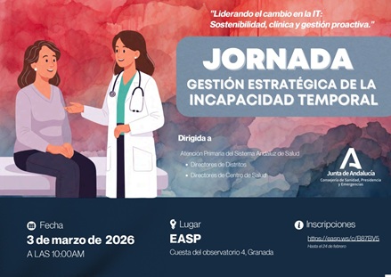PROGRAMAINSCRIPCIÓNJornada ITGESTIÓN ESTRATÉGICA DE LA INCAPACIDAD TEMPORAL «Liderando el cambio en la IT: Sostenibilidad, clínica y gestión proactiva» 3 de marzo de 2026 Escuela Andaluza de Salud Pública La Incapacidad Temporal (IT) ha dejado de ser un mero trámite administrativo para convertirse en un indicador crítico de la gestión sanitaria en Andalucía. El escenario actual,…
