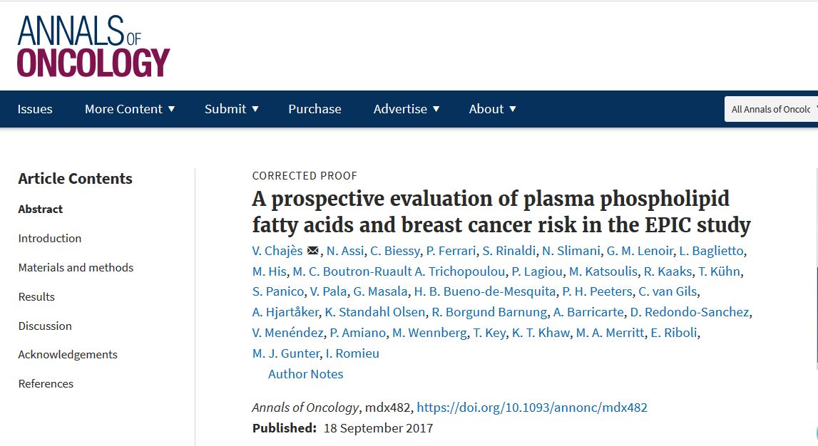 Intakes of specific fatty acids have been postulated to impact breast cancer risk but epidemiological data based on dietary questionnaires remain conflicting.