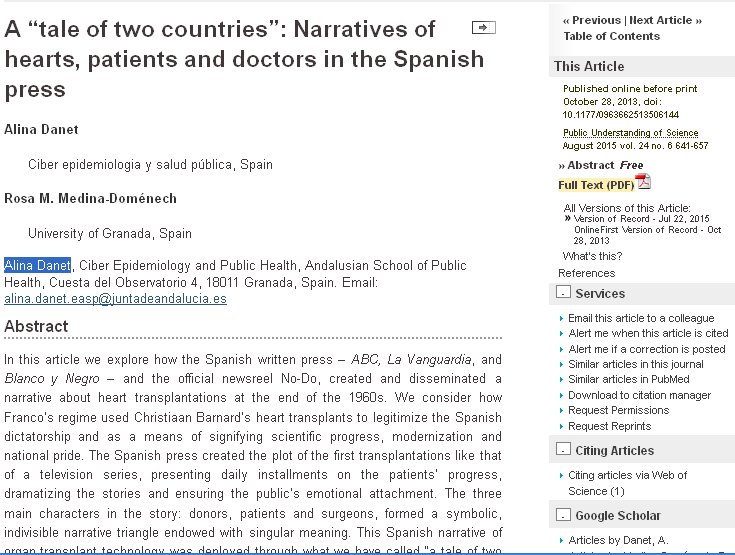 In this article we explore how the Spanish written press – ABC, La Vanguardia, and Blanco y Negro – and the official newsreel No-Do, created and disseminated a narrative about heart transplantations at the end of the 1960s. We consider how Franco’s regime used Christiaan Barnard’s heart transplants to legitimize the Spanish dictatorship and as a means of signifying scientific progress, modernization and national pride. The Spanish press created the plot of the first transplantations like that of a television series, presenting daily installments on the patients’ progress, dramatizing the stories and ensuring the public’s emotional attachment. The three main characters in the story: donors, patients and surgeons, formed a symbolic, indivisible narrative triangle endowed with singular meaning. This Spanish narrative of organ transplant technology was deployed through what we have called “a tale of two countries”, that, emulating the South African’s success, constructed in Martínez-Bordiú, Franco’s son-in-law, a home-grown, masculine scientific personality capable of performing heart surgery and endorsing Franco’s investment in scientific modernization.