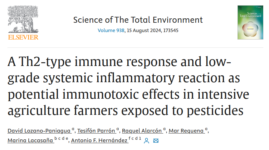 Pesticides are chemicals widely used in agriculture to keep crops healthy and prevent them from being destroyed by pests, thus contributing to a sustainable food and feed production. However, long-term exposure to these compounds may be harmful to human health as they can affect the function of various organs systems, including the immune system. There is growing evidence that pesticides may increase the risk of developing immune-based diseases and inflammation. This study assessed whether greenhouse farmers occupationally exposed to pesticides presented alterations in immunoregulatory proteins, used as surrogate biomarkers of immune function. The study population consisted of 175 greenhouse workers occupationally exposed to pesticides and 91 non-exposed controls. Serum levels of 27 cytokines, chemokines and growth factors were measured using a magnetic bead-based immunoassay in a subpopulation of 111 greenhouse workers and 79 non-exposed controls. Since analytical determinations were performed in two periods of the same crop season with different use of pesticides (period of high and low pesticide exposure), linear mixed models for repeated measures were used to optimize statistical inference. The increase in IL-13, IL-4 and IL-6 observed in greenhouse workers compared to controls, and in the period of high exposure to pesticides relative to that of low exposure, suggest an altered Th1/Th2 balance towards the Th2 response. This finding points to a type-2 inflammation commonly presented as allergic inflammation, which has often been reported in farm-workers and in which pesticide exposure is considered a risk factor. Furthermore, the increase in IL-1β and VEGF, mediators of inflammation and angiogenesis, may suggest a low-grade systemic inflammation that might underlie chronic pathological conditions linked to pesticide exposure.