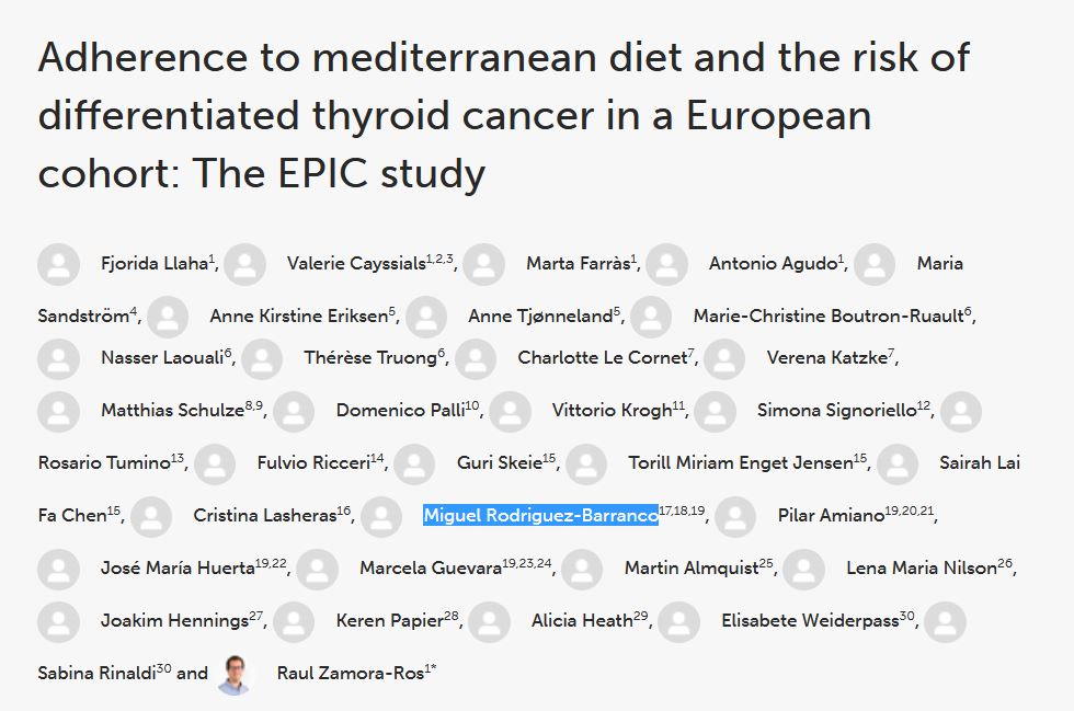 Background: The Mediterranean diet (MD) has been proposed as a healthy diet with a potential to lower the incidence of several types of cancer, but there is no data regarding thyroid cancer (TC). We investigated the association between MD adherence, and its components, and the differentiated TC risk within the European Prospective Investigation into Cancer and Nutrition (EPIC) cohort.