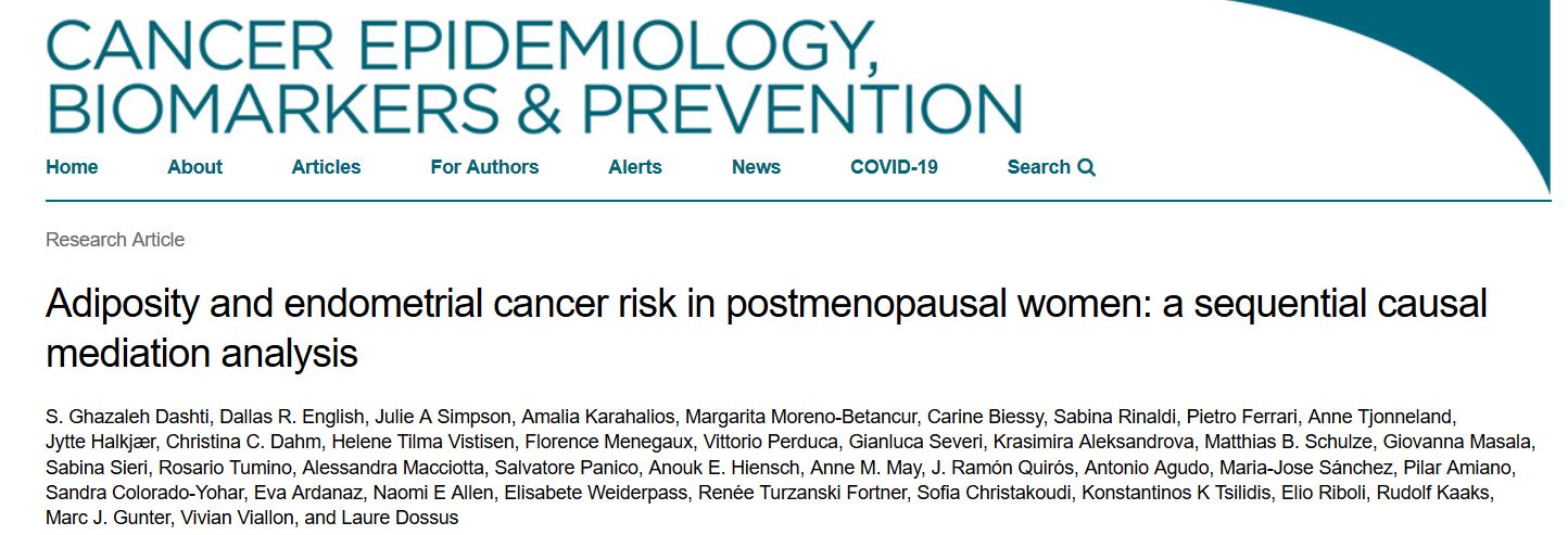 Background Adiposity increases endometrial cancer (EC) risk, possibly through inflammation, hyperinsulinemia, and increasing estrogens. We aimed to quantify the mediating effects of adiponectin (anti-inflammatory adipocytokine); interleukin-6, interleukin-1-receptor antagonist, TNF-receptor-1 and -2, and C-reactive protein (inflammatory status biomarkers); C-peptide (hyperinsulinemia biomarker); free estradiol and estrone (estrogen biomarkers) in the adiposity-EC link in postmenopausal women. Methods We used data from a case-control study within the European Prospective Investigation into Cancer and Nutrition. Eligible women had not had cancer, hysterectomy, diabetes, did not use oral contraceptives or hormone therapy, and were postmenopausal at recruitment. Mediating pathways from adiposity to EC were investigated by estimating natural indirect (NIE) and direct (NDE) effects using sequential mediation analysis. Results The study included 163 cases and 306 controls. The adjusted odds ratio (OR) for EC for BMI≥30vs.18.5≤BMI<25kg/m2 was 2.51 (95%CI 1.26-5.02). The ORsNIE were 1.95 (1.01-3.74) through all biomarkers (72% proportion mediated (PM)) decomposed as: 1.35 (1.06-1.73) through pathways originating with adiponectin (33%PM); 1.13 (0.71-1.80) through inflammation beyond [the potential influence of] adiponectin (13%PM); 1.05 (0.88-1.24) through C-peptide beyond adiponectin and inflammation (5%PM); and 1.22 (0.89-1.67) through estrogens beyond preceding biomarkers (21%PM). The ORNDE not through biomarkers was 1.29 (0.54-3.09). Waist circumference gave similar results. Conclusion Reduced adiponectin and increased inflammatory biomarkers, C-peptide, and estrogens mediated ~70% of increased odds of EC in women with obesity vs. normal weight. Impact If replicated, these results could have implications for identifying targets for intervention to reduce EC risk in women with obesity.