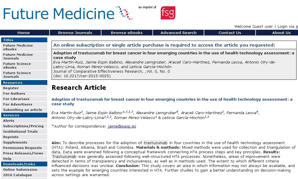 Aim: To describe processes for the adoption of trastuzumab in four countries in the use of health technology assessment (HTA): Poland, Albania, Brazil and Colombia. Materials & methods: Mixed methods were used for collection and triangulation of data. Data were examined following a conceptual framework connecting HTA process steps and key principles. Results: Trastuzumab was generally assessed following well-structured HTA processes. Nonetheless, areas of improvement were detected in terms of transparency and inclusiveness, as well as in methods used. The extent to which different criteria influenced decisions was unclear. Conclusion: This study covers an area in which information may not always be available, and sets the example for emerging countries interested in HTA. Further studies to gain a better understanding on decision-making across settings are warranted.