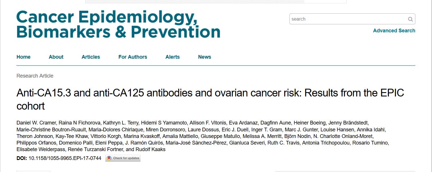 Background:Neoplastic and non-neoplastic events may raise levels of mucins, CA15.3 and CA125, and generate antibodies against them; but their impact on epithelial ovarian cancer (EOC) risk has not been fully defined. Methods:CA15.3, CA125, and IgG1 antibodies against them were measured in 806 women who developed EOC and 1,927 matched controls from the European Prospective Investigation of Nutrition and Cancer. Associations between epidemiologic factors and anti-mucin antibodies were evaluated using generalized linear models; EOC risks associated with anti-mucin antibodies, by themselves or in combination with respective antigens, were evaluated using conditional logistic regression. Results:In controls, lower antibodies against both mucins were associated with current smoking; and, in postmenopausal women, higher levels with longer oral contraceptive use and later-age-at and shorter-interval-since last birth. Lower anti-CA15.3 antibodies were associated with higher body mass and, in premenopausal women, more ovulatory cycles. Higher anti-CA15.3 and anti-CA125 antibodies were associated with higher risk for mucinous EOC occurring ≥ 3 years from enrollment. Long-term risk for serous EOC was reduced in women with low CA125 and high anti-CA125 antibodies relative to women with low concentrations of both. Conclusions:We found general support for the hypothesis that anti-mucin antibody levels correlate with risk factors for EOC. Antibodies alone or in combinations with their antigen may predict longer term risk of specific EOC types. Impact:Anti-CA125 and anti- CA15.3 antibodies alone or in perspective of antigens may be informative in the pathogenesis of EOC subtypes, but less useful for informing risk for all EOC.