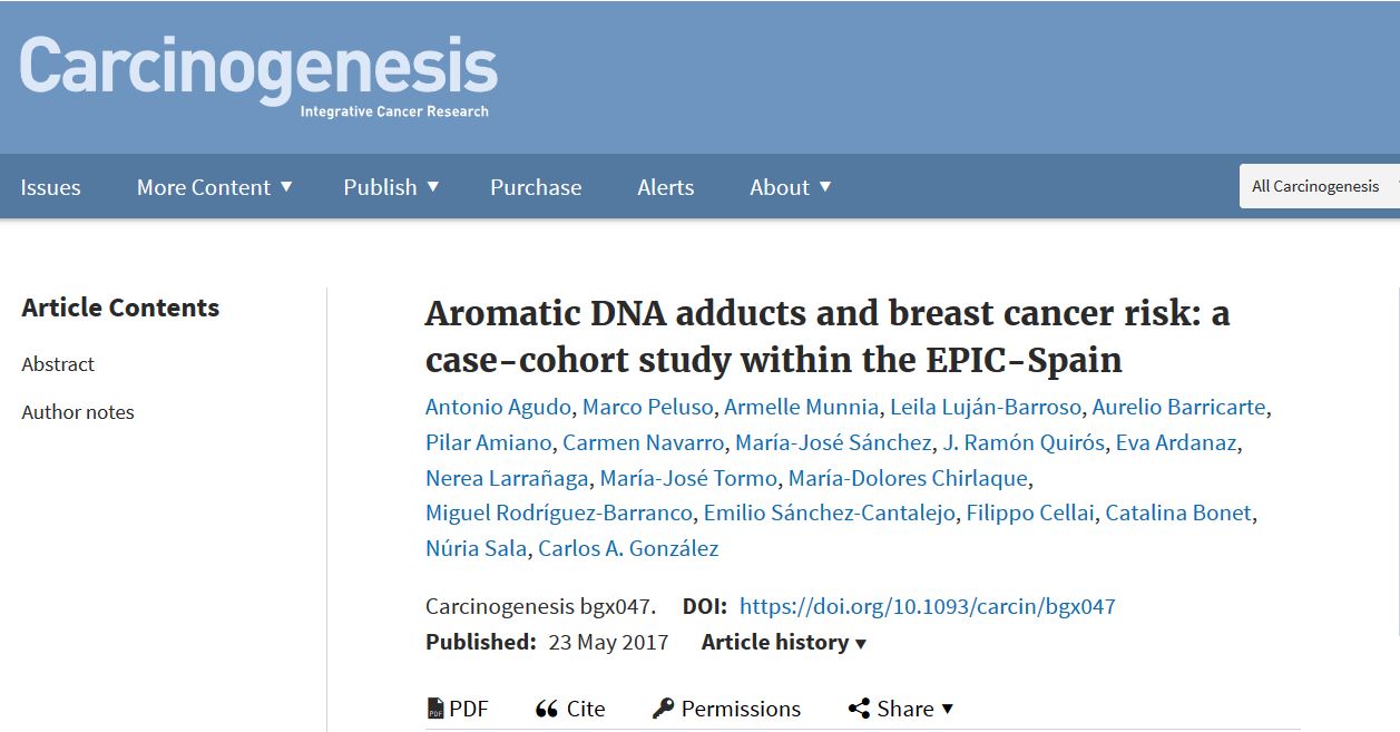 Epidemiologic evidence linking environmental exposure to polycyclic aromatic hydrocarbons (PAH) with breast cancer is limited. Measurement of DNA adducts formed by aromatic compounds, including PAH, has been carried in breast tissue samples and white blood cells from women with breast cancer and different kinds of controls. However, these studies provide inconsistent results and bias cannot be ruled out. During the 7-year follow-up period, 305 women were diagnosed with first primary breast cancer in the EPIC-Spain cohort, and were compared with a sample of 149 women without breast cancer at recruitment, using a case-cohort approach. Aromatic adducts to DNA from leukocytes collected at recruitment were measured by means of the 32P-postlabelling technique. The relative risk (RR) and 95% confidence interval (CI), adjusted by relevant confounders, were estimated by a modified version of Cox proportional hazards model. There was a significant increased risk for developing breast cancer when DNA adduct concentrations were doubled, with adjusted RR of 1.61 (95% CI 1.29-2.01). The increase in breast cancer risk was observed both for pre- and post-menopausal women. There was a significant interaction with tobacco smoking and body mass index (BMI), with higher effect of DNA adducts on breast cancer risk among smokers and women with normal weight. The results from our study support the hypothesis that factors leading to higher levels of aromatic DNA adducts in white blood cells may be involved in development of breast cancer.