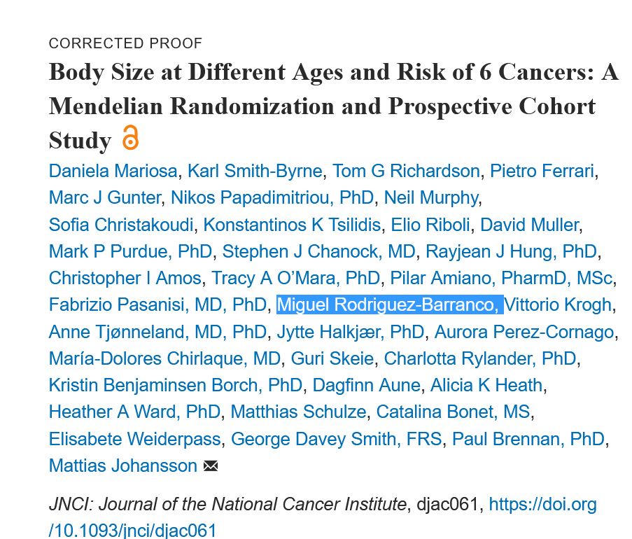 It is unclear if body weight in early life affects cancer risk independently of adult body weight. To investigate this question for 6 obesity-related cancers, we performed univariable and multivariable analyses using 1) Mendelian randomization (MR) analysis and 2) longitudinal analyses in prospective cohorts. Both the MR and longitudinal analyses indicated that larger early life body size was associated with higher risk of endometrial (odds ratioMR = 1.61, 95% confidence interval = 1.23 to 2.11) and kidney (odds ratioMR = 1.40, 95% confidence interval = 1.09 to 1.80) cancer. These associations were attenuated after accounting for adult body size in both the MR and cohort analyses. Early life body mass index (BMI) was not consistently associated with the other investigated cancers. The lack of clear independent risk associations suggests that early life BMI influences endometrial and kidney cancer risk mainly through pathways that are common with adult BMI.