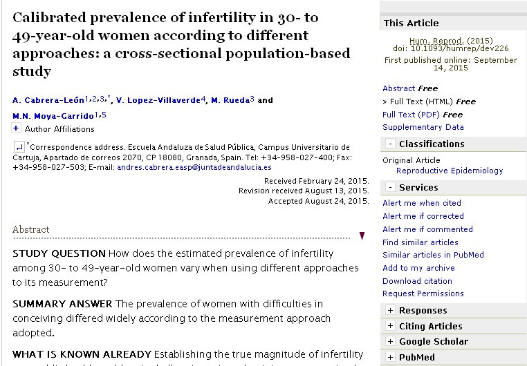 STUDY DESIGN, SIZE, DURATION A face-to-face cross-sectional population-based survey of 443 women aged between 30 and 49 years residing in Huelva, southern Spain, was carried out. The sample size estimation was based on an assumed prevalence of infertility of 19%, a sampling error of ±4.84 percentage points, a design effect of 1.8 and a 95% confidence level. The information was collected in 2011.