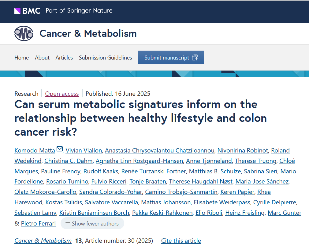 Lifestyle and untargeted metabolomic data were available from a nested case–control study within the European Prospective Investigation into Cancer and Nutrition (EPIC), including 1,067 colon cancer cases and 1,067 controls matched on age, sex, study centre, and blood collection time. Serum samples were analyzed using liquid chromatography-mass spectrometry. The Healthy Lifestyle Index (HLI) score was derived from smoking habits, alcohol intake, body mass index (BMI), physical activity, and diet. Penalised regression was applied in controls to derive metabolic signatures for the HLI and the lifestyle components. Associations of lifestyle factors and the metabolic signatures with colon cancer risk were estimated in conditional logistic regression models, overall and by sex and SEP.