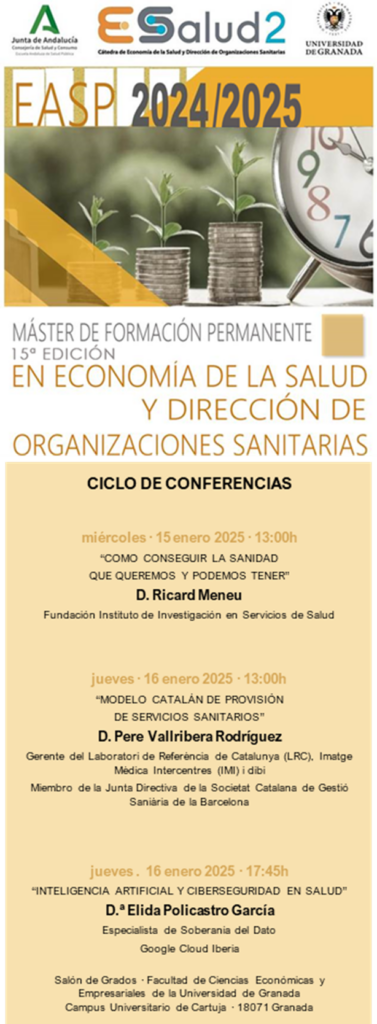 El Director Gerente de la Escuela Andaluza de Salud Pública y la Dirección del XV Máster de Formación Permanente en Economía de la Salud y Dirección de Organizaciones Sanitarias, tienen el honor de invitarte a asistir al siguiente ciclo de conferencias que tendrán lugar en el Salón de Grados de la Facultad de Ciencias Económicas y Empresariales de la Universidad de Granada.