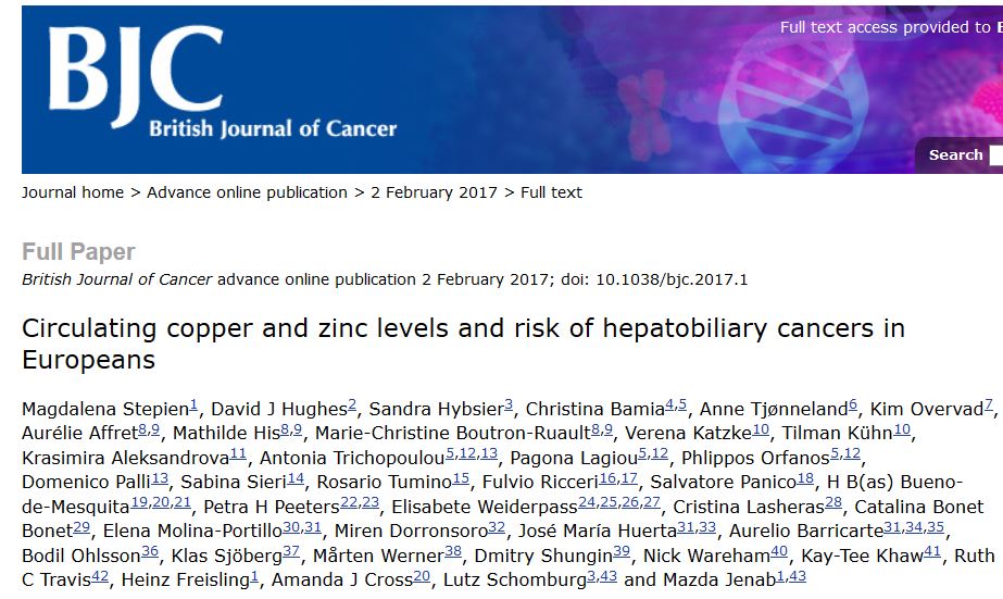 Methods: A nested case–control study was conducted within the European Prospective Investigation into Cancer and Nutrition cohort. Serum zinc and copper levels were measured in baseline blood samples by total reflection X-ray fluorescence in cancer cases (HCC n=106, IHDB n=34, GBTC n=96) and their matched controls (1:1). The Cu/Zn ratio, an indicator of the balance between the micronutrients, was computed. Multivariable adjusted odds ratios and 95% confidence intervals (OR; 95% CI) were used to estimate cancer risk.