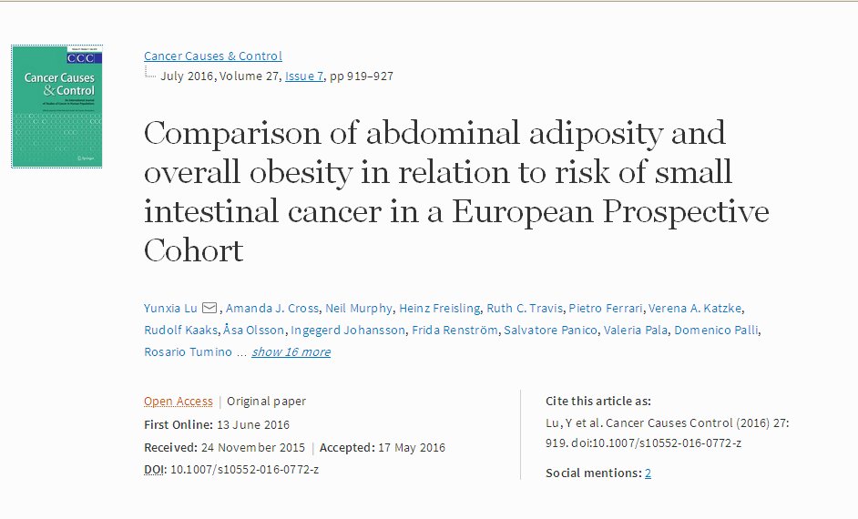 Abdominal obesity is a potential risk factor for adenocarcinoma in the small intestine.