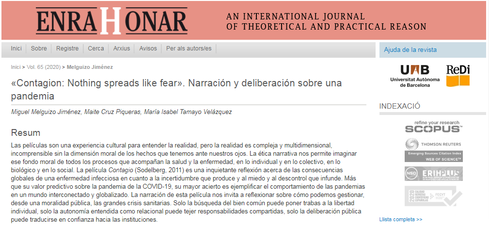 Las películas son una experiencia cultural para entender la realidad, pero la realidad es compleja y multidimensional, incomprensible sin la dimensión moral de los hechos que tenemos ante nuestros ojos. La ética narrativa nos permite imaginar ese fondo moral de todos los procesos que acompañan la salud y la enfermedad, en lo individual y en lo colectivo, en lo biológico y en lo social. La película Contagio (Sodelberg, 2011) es una inquietante reflexión acerca de las consecuencias globales de una enfermedad infecciosa en cuanto a la incertidumbre que produce y al miedo y al descontrol que infunde. Más que su valor predictivo sobre la pandemia de la COVID-19, su mayor acierto es ejemplificar el comportamiento de las pandemias en un mundo interconectado y globalizado. La narración de esta película nos invita a reflexionar sobre cómo podemos gestionar, desde una moralidad pública, las grandes crisis sanitarias. Solo la búsqueda del bien común puede poner trabas a la libertad individual, solo la autonomía entendida como relacional puede tejer responsabilidades compartidas, solo la deliberación pública puede traducirse en confianza hacia las instituciones.