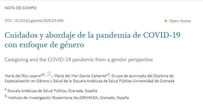 En la actual situación de pandemia, la literatura urge a tener en cuenta el enfoque de género para no profundizar las desigualdades existentes, como ya ocurrió en anteriores epidemias. Esta nota de campo pretende describir una experiencia de aplicación del análisis de género al impacto de la pandemia sobre la salud de la población, realizado por el alumnado y el profesorado del Diploma de Género y Salud de la Escuela Andaluza de Salud Pública-Universidad de Granada. La actividad consistió en realizar una revisión de la literatura sobre los cuidados y su impacto en la salud en el contexto de crisis sanitaria, un análisis de género de la información y una reflexión y un debate compartidos. El debate se agrupó en torno a cinco reflexiones, en las que los cuidados se situaron en el centro. Cada reflexión se ligó a la necesidad de incorporar el enfoque de género en medidas y actuaciones concretas.