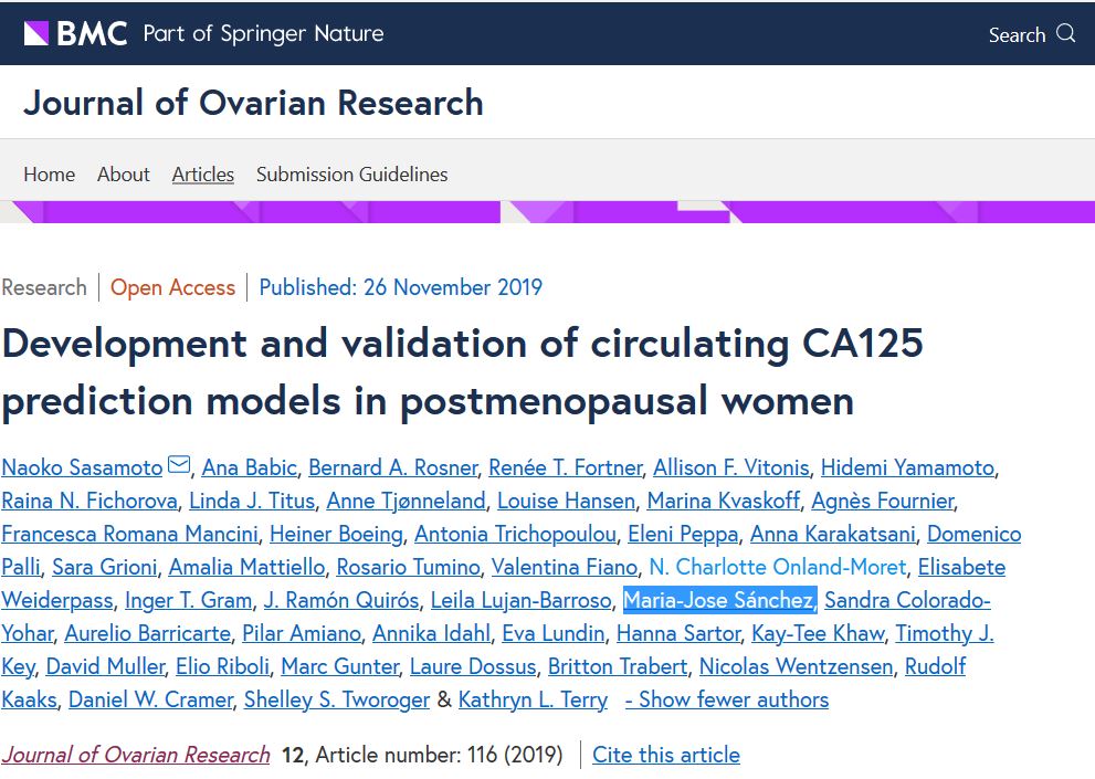 We developed and validated linear and dichotomous (≥35 U/mL) circulating CA125 prediction models in postmenopausal women without ovarian cancer who participated in one of five large population-based studies: Prostate, Lung, Colorectal, and Ovarian Cancer Screening Trial (PLCO, n = 26,981), European Prospective Investigation into Cancer and Nutrition (EPIC, n = 861), the Nurses’ Health Studies (NHS/NHSII, n = 81), and the New England Case Control Study (NEC, n = 923). The prediction models were developed using stepwise regression in PLCO and validated in EPIC, NHS/NHSII and NEC.