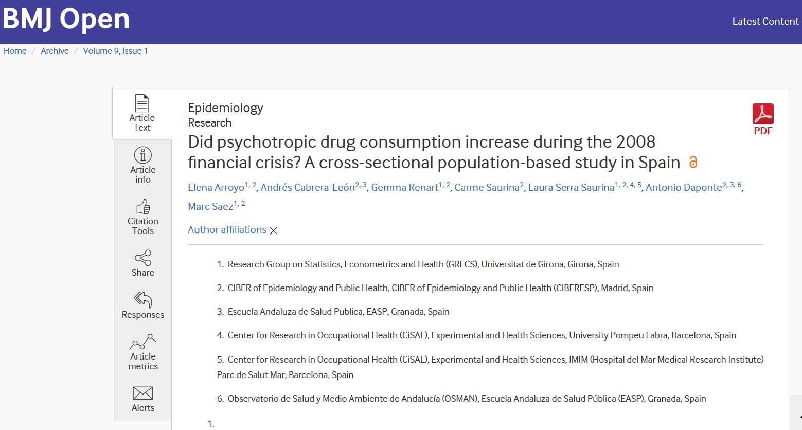 Objectives and setting Although psychotropic drugs are used to treat mental health disorders, little evidence analyses the effects the 2008 economic downturn had on psychotropic drug consumption in the case of Spain. We analyse these effects, considering both gender and employment situation.
