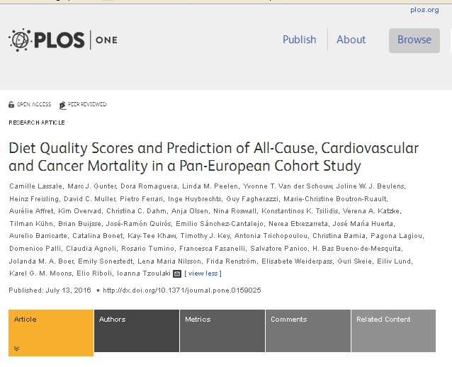 Scores of overall diet quality have received increasing attention in relation to disease aetiology; however, their value in risk prediction has been little examined. The objective was to assess and compare the association and predictive performance of 10 diet quality scores on 10-year risk of all-cause, CVD and cancer mortality in 451,256 healthy participants to the European Prospective Investigation into Cancer and Nutrition, followed-up for a median of 12.8y. All dietary scores studied showed significant inverse associations with all outcomes. The range of HRs (95% CI) in the top vs. lowest quartile of dietary scores in a composite model including non-invasive factors (age, sex, smoking, body mass index, education, physical activity and study centre) was 0.75 (0.72–0.79) to 0.88 (0.84–0.92) for all-cause, 0.76 (0.69–0.83) to 0.84 (0.76–0.92) for CVD and 0.78 (0.73–0.83) to 0.91 (0.85–0.97) for cancer mortality. Models with dietary scores alone showed low discrimination, but composite models also including age, sex and other non-invasive factors showed good discrimination and calibration, which varied little between different diet scores examined. Mean C-statistic of full models was 0.73, 0.80 and 0.71 for all-cause, CVD and cancer mortality. Dietary scores have poor predictive performance for 10-year mortality risk when used in isolation but display good predictive ability in combination with other non-invasive common risk factors.