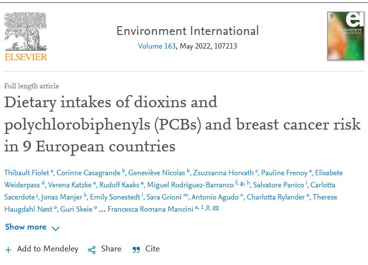 Dioxins and polychlorobiphenyls (PCBs) are persistent organic pollutants that have demonstrated endocrine disrupting properties. Several of these chemicals are carcinogenic and positive associations have been suggested with breast cancer risk. In general population, diet represents the main source of exposure.