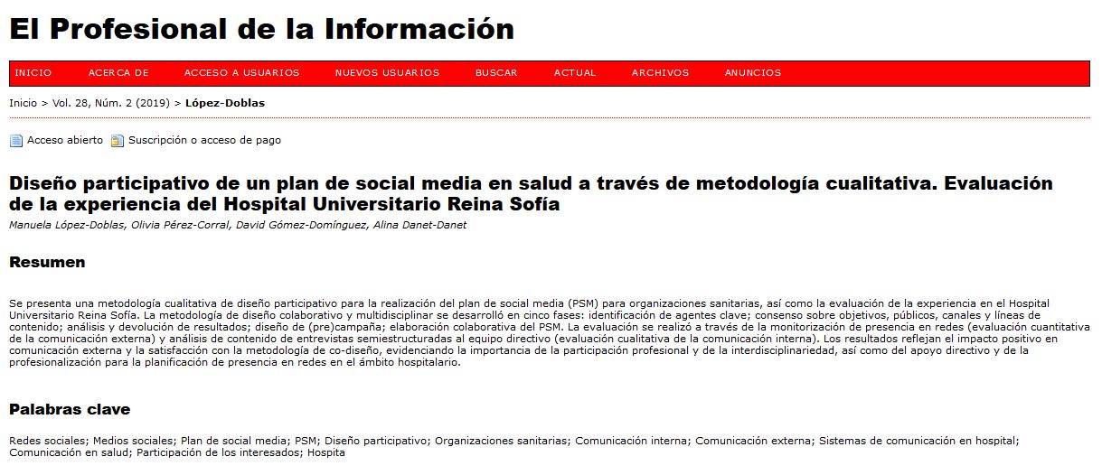 Se presenta una metodología cualitativa de diseño participativo para la realización del plan de social media (PSM) para organizaciones sanitarias, así como la evaluación de la experiencia en el Hospital Universitario Reina Sofía. La metodología de diseño colaborativo y multidisciplinar se desarrolló en cinco fases: identificación de agentes clave; consenso sobre objetivos, públicos, canales y líneas de contenido; análisis y devolución de resultados; diseño de (pre)campaña; elaboración colaborativa del PSM. La evaluación se realizó a través de la monitorización de presencia en redes (evaluación cuantitativa de la comunicación externa) y análisis de contenido de entrevistas semiestructuradas al equipo directivo (evaluación cualitativa de la comunicación interna). Los resultados reflejan el impacto positivo en comunicación externa y la satisfacción con la metodología de co-diseño, evidenciando la importancia de la participación profesional y de la interdisciplinariedad, así como del apoyo directivo y de la profesionalización para la planificación de presencia en redes en el ámbito hospitalario.
