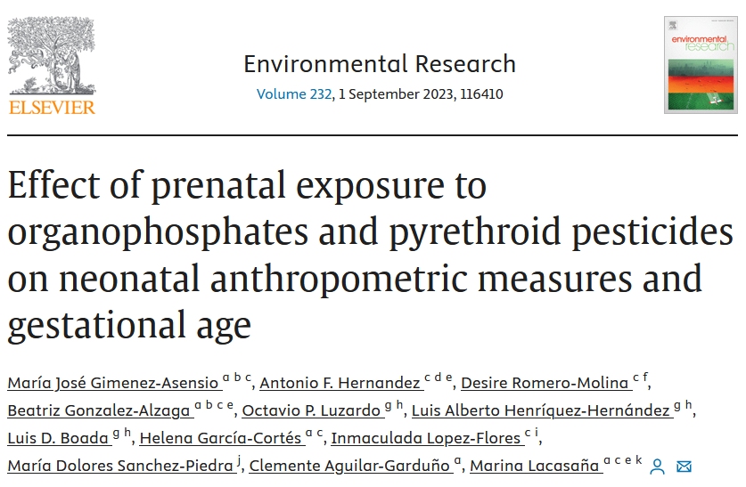 Several studies have examined the association between prenatal exposure to organophosphate and pyrethroid pesticides and their impact on foetal growth and newborn anthropometry; however, the available evidence is limited and inconclusive. This study examined whether prenatal organophosphate and pyrethroid pesticide exposure was associated with anthropometric measures at birth (weight, length, head circumference), ponderal index, gestational age, and prematurity in 537 mother-child pairs. These were randomly selected from the 800 pairs participating in the prospective birth cohort GENEIDA (Genetics, early life environmental exposures and infant development in Andalusia). Six non-specific organophosphate metabolites (dialkylphosphates, DAPs), one metabolite relatively specific to chlorpyrifos (3,5,6-trichloro-2-pyridinol, TCPy) and a common metabolite to several pyrethroids (3-phenoxybenzoic acid, 3-PBA) were measured in maternal urine from the 1st and 3rd pregnancy trimesters. Information on anthropometric measures at birth, gestational age and prematurity was retrieved from medical records. The sum on a molar basis of DAPs with methyl (ƩDMs) and ethyl (ƩDEs) moieties and the sum of the 6 DAPs metabolites (ƩDAPs) was calculated for both trimesters of pregnancy. High urinary levels of dimethyl phosphate (DMP) during the 3rd trimester were associated with a decrease in birth weight (β = −0.24; 95% CI: 0.41; −0.06) and birth length (β = −0.20; 95% CI: 0.41; 0.02). Likewise, ΣDMs during 3rd trimester were near-significantly associated with decreased birth weight (β = −0.18; 95% CI: 0.37; 0.01). In turn, increased urinary TCPy during 1st trimester was associated with a decreased head circumference (β = −0.31; 95% CI: 0.57; −0.06). Finally, an increase in 3-PBA in the 1st trimester was associated with a decreased gestational age (β = −0.36 95% CI: 0.65–0.08), whereas increased 3-PBA at 1st and 3rd trimester was associated with prematurity. These results indicate that prenatal exposure to organophosphate and pyrethroid insecticides could affect normal foetal growth, shorten gestational age and alter anthropometric measures at birth.