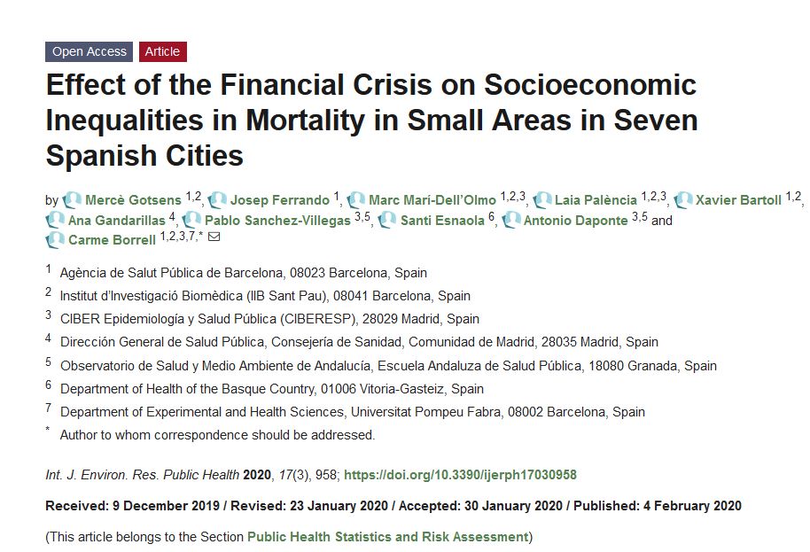 Background: The aim of this study was to analyze the trend in socioeconomic inequalities in mortality in small areas due to several specific causes before (2001–2004, 2005–2008) and during (2009–2012) the economic crisis in seven Spanish cities. Methods: This ecological study of trends, with census tracts as the areas of analysis, was based on three periods. Several causes of death were studied. A socioeconomic deprivation index was calculated for each census tract. For each small area, we estimated standardized mortality ratios, and controlled for their variability using Bayesian models (sSMR). We also estimated the relative risk of mortality according to deprivation in the different cities, periods, and sexes. Results: In general, a similar geographical pattern was found for the socioeconomic deprivation index and sSMR. For men, there was an association in all cities between the deprivation index and all-cause mortality that remained stable over the three periods. For women, there was an association in Barcelona, Granada, and Sevilla between the deprivation index and all-cause mortality in the third period. Patterns by causes of death were more heterogeneous. Conclusions: After the start of the financial crisis, socioeconomic inequalities in total mortality in small areas of Spanish cities remained stable in most cities, although several causes of death showed a different pattern.