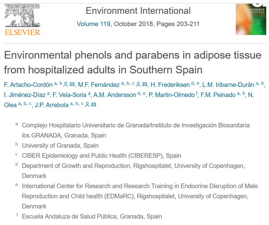 Concentrations of bisphenol-A (BPA), benzophenone-3 (BP-3), triclosan (TCS), three chlorophenols (2,4-DCP, 2,5-DCP and 2,4,5-TCP) and two phenylphenols (2-PP and 4-PP), triclocarban (TCCB) and parabens [methyl- (MeP), ethyl- (EtP), propyl- (n-PrP and i-PrP), butyl- (n-BuP and i-BuP) and benzyl-paraben (BzP)] were analysed in adipose tissue samples from a subcohort of 144 participants. Spearman correlation tests were performed, followed by stepwise multivariable linear regression analyses to assess determinants of the exposure.