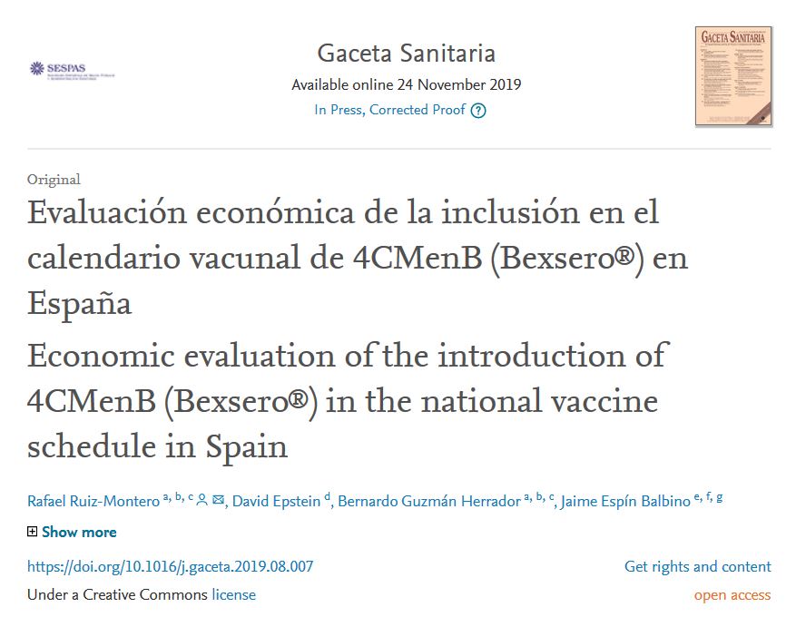 Bexsero® (4CMenB), vacuna contra el meningococo B, fue autorizada en Europa en 2013. En España, a pesar de que el meningococo B es la principal causa de enfermedad meningocócica invasiva (EMI), Bexsero® está recomendada y financiada para pacientes con alto riesgo de EMI pero no de forma sistemática en el calendario vacunal del SNS.