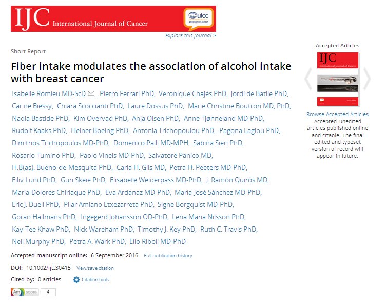 Alcohol intake has been related to an increased risk of breast cancer (BC) while dietary fiber intake has been inversely associated to BC risk. A beneficial effect of fibers on ethanol carcinogenesis through their impact on estrogen levels is still controversial. We investigated the role of dietary fiber as a modifying factor of the association of alcohol and breast cancer using data from the European Prospective Investigation into Cancer and Nutrition (EPIC). This study included 334,850 women aged 35-70 years at baseline enrolled in the ten countries of the EPIC study and followed up for 11.0 years on average. Information on fiber and alcohol intake at baseline and average lifetime alcohol intake were calculated from country-specific dietary and lifestyle questionnaires. Hazard ratios (HR) of developing invasive breast cancer according to different levels of alcohol and fiber intake were computed. During 3,670,439 person-years, 11,576 incident breast cancer cases were diagnosed. For subjects with low intake of fiber (<18.5 g/day), the risk of BC per 10g/day of alcohol intake was 1.06 (1.03-1.08) while among subjects with high intake of fiber (>24.2 g/day) the risk of BC was 1.02 (0.99-1.05) (test for interaction p=0.011). This modulating effect was stronger for fiber from vegetables. Our results suggest that fiber intake may modulate the positive association of alcohol intake and BC. This article is protected by copyright. All rights reserved. © 2014 Wiley Periodicals, Inc.