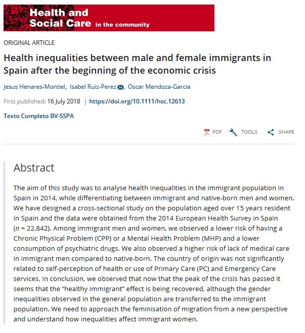 The aim of this study was to analyse health inequalities in the immigrant population in Spain in 2014, while differentiating between immigrant and native‐born men and women. We have designed a cross‐sectional study on the population aged over 15 years resident in Spain and the data were obtained from the 2014 European Health Survey in Spain (n = 22,842). Among immigrant men and women, we observed a lower risk of having a Chronic Physical Problem (CPP) or a Mental Health Problem (MHP) and a lower consumption of psychiatric drugs. We also observed a higher risk of lack of medical care in immigrant men compared to native‐born. The country of origin was not significantly related to self‐perception of health or use of Primary Care (PC) and Emergency Care services. In conclusion, we observed that now that the peak of the crisis has passed it seems that the “healthy immigrant” effect is being recovered, although the gender inequalities observed in the general population are transferred to the immigrant population. We need to approach the feminisation of migration from a new perspective and understand how inequalities affect immigrant women.