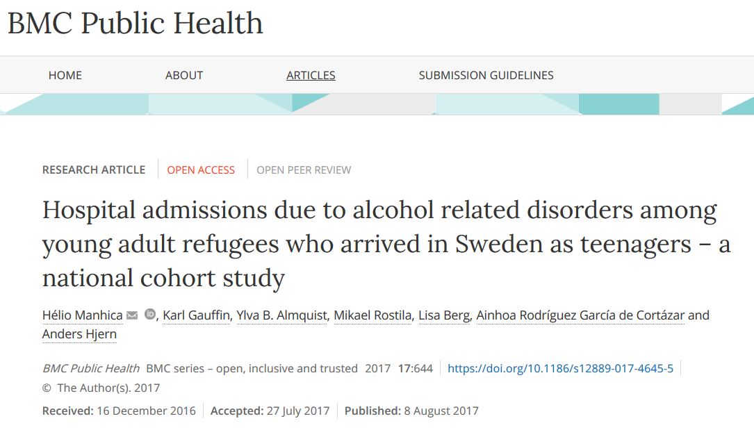 Young refugees have lower risks of alcohol disorders compared with native Swedes. The risks were higher in unaccompanied young (male) refugees compared to the accompanied ones. Moreover, Somalian refugees who had lived in Sweden for more than ten years seems to be particularly vulnerable to alcohol related disorders.