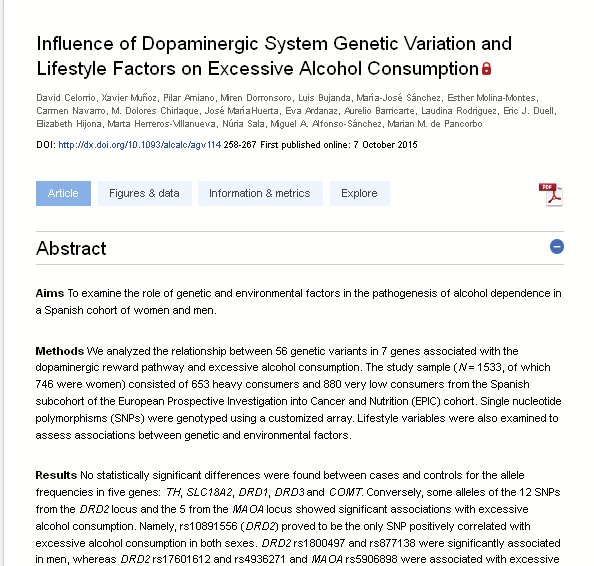 Methods We analyzed the relationship between 56 genetic variants in 7 genes associated with the dopaminergic reward pathway and excessive alcohol consumption. The study sample (N = 1533, of which 746 were women) consisted of 653 heavy consumers and 880 very low consumers from the Spanish subcohort of the European Prospective Investigation into Cancer and Nutrition (EPIC) cohort. Single nucleotide polymorphisms (SNPs) were genotyped using a customized array. Lifestyle variables were also examined to assess associations between genetic and environmental factors.