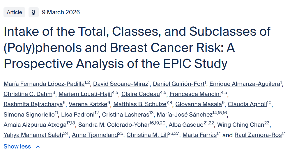 Polyphenols represent the largest and most diverse class of dietary antioxidants. Epidemiological evidence linking specific (poly)phenol classes, such as flavonoids and lignans, to breast cancer (BC) risk remains limited and largely inconclusive in prospective studies. The aim of this study is to examine the association between the intake of total (poly)phenols—and its classes and subclasses—and BC risk—overall and by subtypes (estrogen, progesterone, and human epidermal growth factor receptor 2 (HER2))—in the European Prospective Investigation into Cancer and Nutrition (EPIC) cohort. The EPIC cohort includes 257,960 adult women from seven European countries. During a mean follow-up of 14 years, there were 10,722 incident overall BC cases. Associations were computed using Cox regression models adjusted for potential confounders. No significant associations were found between total (poly)phenol intake and overall BC risk (HRQ5 vs. Q1 = 1.02; 95% CI: 0.95–1.11). In addition, null associations were mostly found between classes and subclasses of (poly)phenols and BC subtypes. After stratifying by menopausal status, no significant associations were observed. In conclusion, this study found no evidence of associations between the intake of any class or subclass of (poly)phenols and BC risk in the European population.