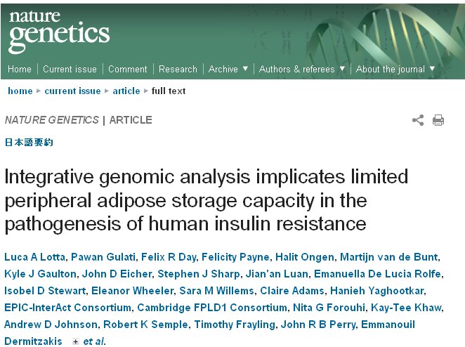 Insulin resistance is a key mediator of obesity-related cardiometabolic disease, yet the mechanisms underlying this link remain obscure. Using an integrative genomic approach, we identify 53 genomic regions associated with insulin resistance phenotypes (higher fasting insulin levels adjusted for BMI, lower HDL cholesterol levels and higher triglyceride levels) and provide evidence that their link with higher cardiometabolic risk is underpinned by an association with lower adipose mass in peripheral compartments. Using these 53 loci, we show a polygenic contribution to familial partial lipodystrophy type 1, a severe form of insulin resistance, and highlight shared molecular mechanisms in common/mild and rare/severe insulin resistance. Population-level genetic analyses combined with experiments in cellular models implicate CCDC92, DNAH10 and L3MBTL3 as previously unrecognized molecules influencing adipocyte differentiation. Our findings support the notion that limited storage capacity of peripheral adipose tissue is an important etiological component in insulin-resistant cardiometabolic disease and highlight genes and mechanisms underpinning this link.