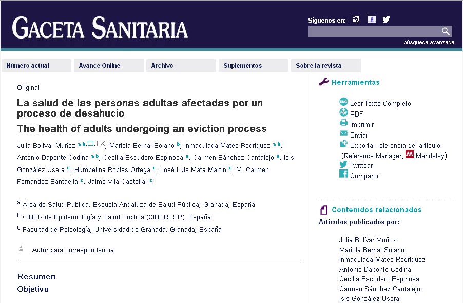 Nuestros resultados indican que las personas afectadas por un proceso de desahucio en Granada y su área metropolitana, en el actual contexto de crisis, expresan una peor salud en relación a la población general andaluza. Es necesario seguir investigando sobre la salud y los desahucios, desde diferentes aproximaciones metodológicas, para una mejor comprensión de este problema.