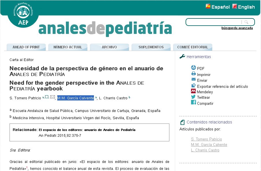 Gracias al editorial publicado en junio: «El espacio de los editores: anuario de Anales de Pediatría»1, hemos conocido el balance anual de esta revista. El proceso de evaluación de las revistas científicas es una actividad fundamental para mejorar la calidad y transparencia de sus contenidos. Con la intención de enriquecer este ejercicio de evaluación, proponemos incluir la perspectiva de género en sus evaluaciones.