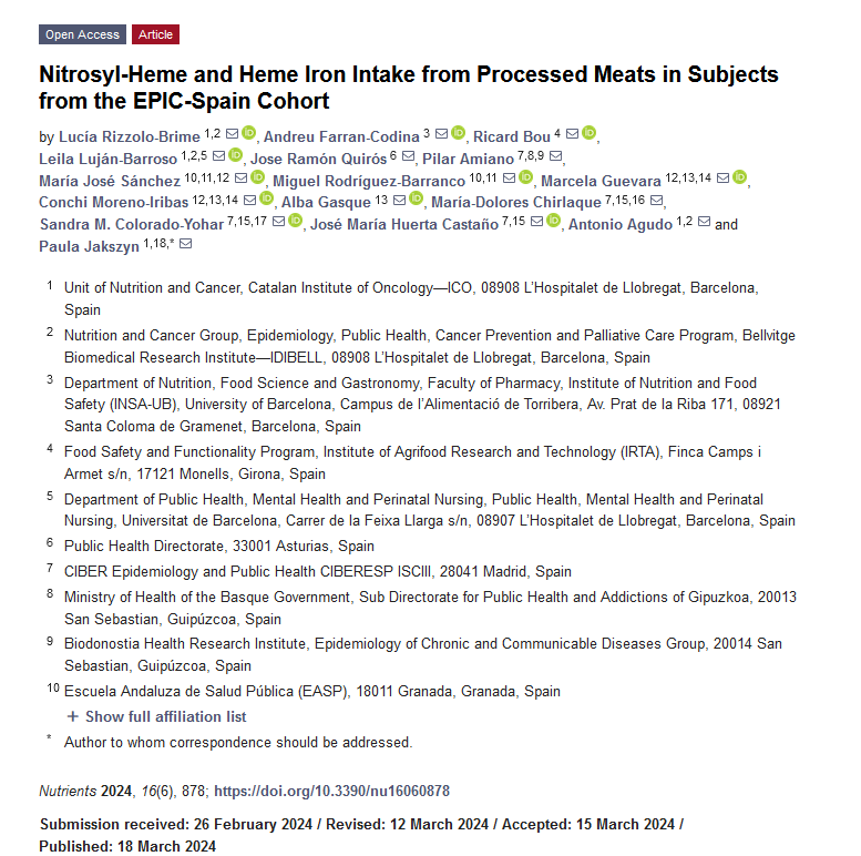 Background: The consumption of processed meats (PMs) and red meats are linked to the likelihood of developing colorectal cancer. Various theories have been proposed to explain this connection, focusing on nitrosyl-heme and heme iron intake. We hypothesized that differences in nitrosyl-heme and heme iron intakes will be associated with various sociodemographic and lifestyle factors. Methods: The study included 38,471 healthy volunteers (62% females) from five Spanish regions within the EPIC-Spain cohort. High-Performance Liquid Chromatography (HPLC) determined nitrosyl-heme and heme iron levels in the 39 most consumed PMs. Food intake was assessed using validated questionnaires in interviews. Nitrosyl-heme and heme iron intakes, adjusted for sex, age, body mass index (BMI), center, and energy intake, were expressed as geometric means due to their skewed distribution. Variance analysis identified foods explaining the variability of nitrosyl-heme and heme iron intakes. Results: The estimated intakes were 528.6 µg/day for nitrosyl-heme and 1676.2 µg/day for heme iron. Significant differences in nitrosyl-heme intake were found by sex, center, energy, and education level. Heme iron intake varied significantly by sex, center, energy, and smoking status. “Jamón serrano” and “jamón cocido/jamón de York” had the highest intake values, while “morcilla asturiana” and “sangrecilla” were key sources of nitrosyl-heme and heme iron. Conclusions: This is the first study to estimate levels of nitrosyl-heme intake directly in PMs for a large sample, revealing variations based on sex, BMI, smoking, and activity. Its data aids future exposure estimations in diverse populations.