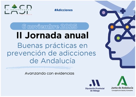 #AdiccionesII Jornada anual Buenas prácticas en prevención de adicciones de Andalucía Avanzando con evidencias 6 de noviembre de 2025 Lugar de celebración Edificio “La Térmica” (Diputación de Málaga). Avda. de Los Guindos, 48. Carretera de Cádiz. 29004, Málaga https://latermicamalaga.com Destinatarios Profesionales interesados en la prevención de adicciones. Organiza Dirección General de Cuidados y Atención Sociosanitaria.…