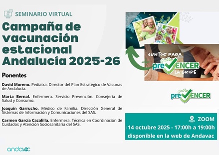 preVencerSEMINARIO VIRTUAL ANDAVAC Campaña de vacunación estacional Andalucía 2025-26 14 de octubre de 2025 – 17:00 – 19:00 horas Nuevo seminario online donde David Moreno, Marta Bernal, Joaquín Garrucho y Carmen García nos presentarán las novedades para la Campaña de Vacunación Estacional en Andalucía para la temporada 2025-26. El seminario está disponible en diferido…