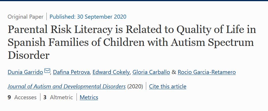 Families of children with autism spectrum disorder (ASD) often experience much more negative perceptions of their family quality of life (FQoL). To investigate key factors that may shape these experiences, we conducted a case–control study of sixty-one Spanish families (29 with a child with ASD) using a broad psychosocial assessment (e.g., ASD severity, social support, demographics), including the first direct test of the relationship between FQoL and parental risk literacy (i.e., the ability to evaluate and understand risk, as measured by numeracy). Results revealed that numeracy was associated with differences in perceived FQoL among families of children with ASD (R2 = .10), a finding that held across several models statistically controlling for the influence of other variables. Findings suggest that parental risk literacy skills may generally be associated with differences in decision making vulnerabilities (e.g., risk evaluation and interpretation) that influence family outcomes including FQoL.