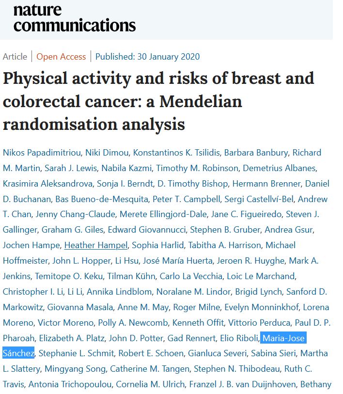 Physical activity has been associated with lower risks of breast and colorectal cancer in epidemiological studies; however, it is unknown if these associations are causal or confounded. In two-sample Mendelian randomisation analyses, using summary genetic data from the UK Biobank and GWA consortia, we found that a one standard deviation increment in average acceleration was associated with lower risks of breast cancer (odds ratio [OR]: 0.51, 95% confidence interval [CI]: 0.27 to 0.98, P-value = 0.04) and colorectal cancer (OR: 0.66, 95% CI: 0.48 to 0.90, P-value = 0.01). We found similar magnitude inverse associations for estrogen positive (ER+ve) breast cancer and for colon cancer. Our results support a potentially causal relationship between higher physical activity levels and lower risks of breast cancer and colorectal cancer. Based on these data, the promotion of physical activity is probably an effective strategy in the primary prevention of these commonly diagnosed cancers.