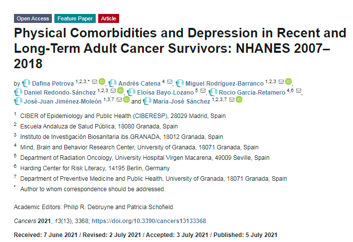 Many adult cancer patients present one or more physical comorbidities. Besides interfering with treatment and prognosis, physical comorbidities could also increase the already heightened psychological risk of cancer patients. To test this possibility, we investigated the relationship between physical comorbidities with depression symptoms in a sample of 2073 adult cancer survivors drawn from the nationally representative National Health and Nutrition Examination Survey (NHANES) (2007–2018) in the U.S. Based on information regarding 16 chronic conditions, the number of comorbidities diagnosed before and after the cancer diagnosis was calculated. The number of comorbidities present at the moment of cancer diagnosis was significantly related to depression risk in recent but not in long-term survivors. Recent survivors who suffered multimorbidity had 3.48 (95% CI 1.26–9.55) times the odds of reporting significant depressive symptoms up to 5 years after the cancer diagnosis. The effect of comorbidities was strongest among survivors of breast cancer. The comorbidities with strongest influence on depression risk were stroke, kidney disease, hypertension, obesity, asthma, and arthritis. Information about comorbidities is usually readily available and could be useful in streamlining depression screening or targeting prevention efforts in cancer patients and survivors. A multidimensional model of the interaction between cancer and other physical comorbidities on mental health is proposed