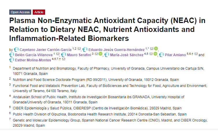 Background: Little is known about the interlinkages between dietary and plasma non-enzymatic antioxidant capacity (D-NEAC and P-NEAC, respectively) and the body’s antioxidant and inflammation response. Our aim was to explore these associations in 210 participants from two Spanish European Prospective Investigation into Cancer and Nutrition (EPIC) centers. (2) Methods: D-NEAC was estimated using published NEAC values in food. P-NEAC and total polyphenols (TP) were quantified by FRAP (ferric-reducing antioxidant power), TRAP (total radical-trapping antioxidant parameter), TEAC-ABTS (trolox equivalent antioxidant capacity-Azino Bis Thiazoline Sulfonic), ORAC (oxygen radical absorbance capacity) and Folin–Ciocalteu assays. Nutrient antioxidants (carotenes, α-tocopherol, ascorbic acid, retinol, uric acid, Q9 and Q10 coenzymes) and inflammation markers (IL-6, IL-8, CRP, TNF-α, PAI-I, resistin and adiponectin) were also analyzed. Spearman correlation and linear regression analyses were performed in association analyses. Analyses were stratified by covariates and groups were defined using cluster analysis. (3) Results: P-FRAP was correlated with D-NEAC, and significantly associated with P-NEAC in multivariate adjusted models. P-FRAP levels were also significantly associated with plasma antioxidants (log2 scale: TP β = 0.26; ascorbic acid β = 0.03; retinol β = 0.08; α-tocopherol β = 0.05; carotenes β = 0.02; Q10 β = 0.06; uric acid β = 0.25), though not with inflammation-related biomarkers. Different profiles of individuals with varying levels of P-NEAC and biomarkers were found. (4) Conclusions: P-NEAC levels were to some extent associated with D-NEAC and plasma antioxidants, yet not associated with inflammation response