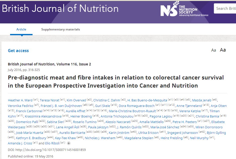 Improvements in colorectal cancer (CRC) detection and treatment have led to greater numbers of CRC survivors, for whom there is limited evidence on which to provide dietary guidelines to improve survival outcomes. Higher intake of red and processed meat and lower intake of fibre are associated with greater risk of developing CRC, but there is limited evidence regarding associations with survival after CRC diagnosis. Among 3789 CRC cases in the European Prospective Investigation into Cancer and Nutrition (EPIC) cohort, pre-diagnostic consumption of red meat, processed meat, poultry and dietary fibre was examined in relation to CRC-specific mortality (n 1008) and all-cause mortality (n 1262) using multivariable Cox regression models, adjusted for CRC risk factors. Pre-diagnostic red meat, processed meat or fibre intakes (defined as quartiles and continuous grams per day) were not associated with CRC-specific or all-cause mortality among CRC survivors; however, a marginal trend across quartiles of processed meat in relation to CRC mortality was detected (P 0·053). Pre-diagnostic poultry intake was inversely associated with all-cause mortality among women (hazard ratio (HR)/20 g/d 0·92; 95 % CI 0·84, 1·00), but not among men (HR 1·00; 95 % CI 0·91, 1·09) (Pfor heterogeneity=0·10). Pre-diagnostic intake of red meat or fibre is not associated with CRC survival in the EPIC cohort. There is suggestive evidence of an association between poultry intake and all-cause mortality among female CRC survivors and between processed meat intake and CRC-specific mortality; however, further research using post-diagnostic dietary data is required to confirm this relationship.