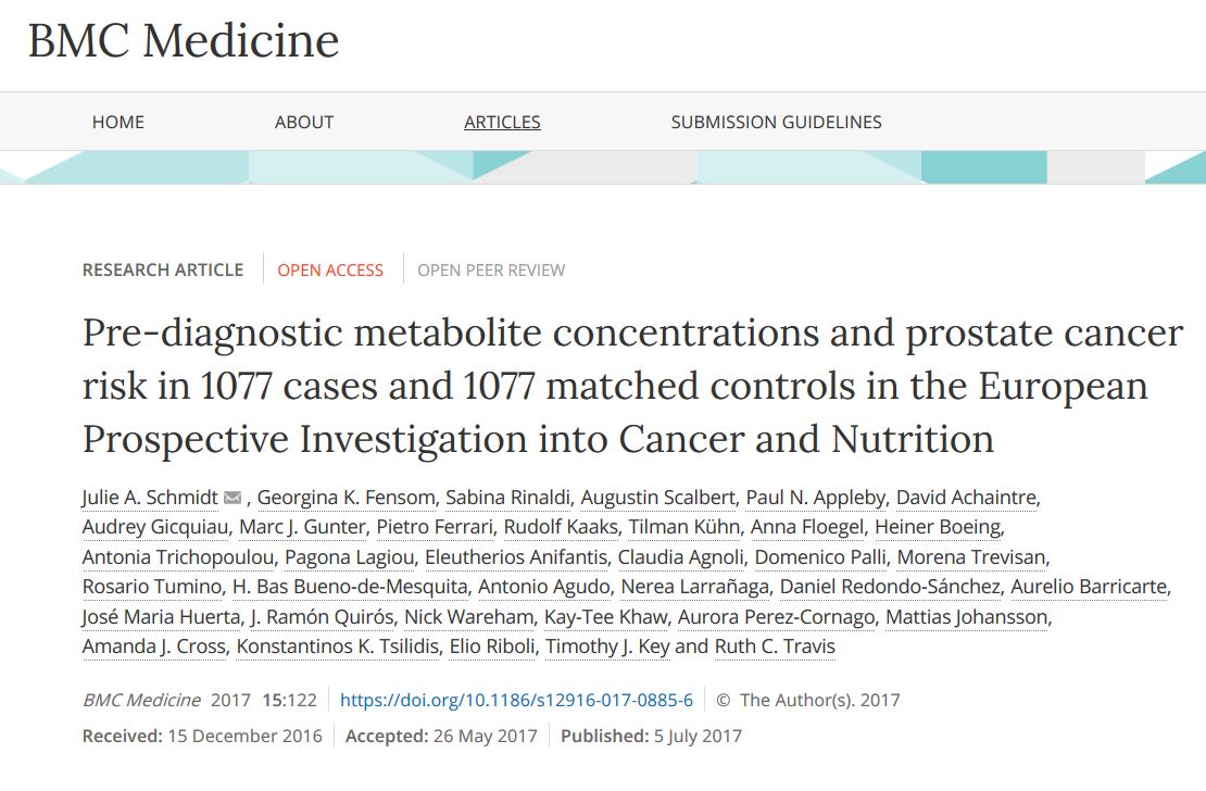 In a case-control study nested in the European Prospective Investigation into Cancer and Nutrition, pre-diagnostic plasma concentrations of 122 metabolites (including acylcarnitines, amino acids, biogenic amines, glycerophospholipids, hexose and sphingolipids) were measured using targeted mass spectrometry (AbsoluteIDQ p180 Kit) and compared between 1077 prostate cancer cases and 1077 matched controls. Risk of prostate cancer associated with metabolite concentrations was estimated by multi-variable conditional logistic regression, and multiple testing was accounted for by using a false discovery rate controlling procedure.