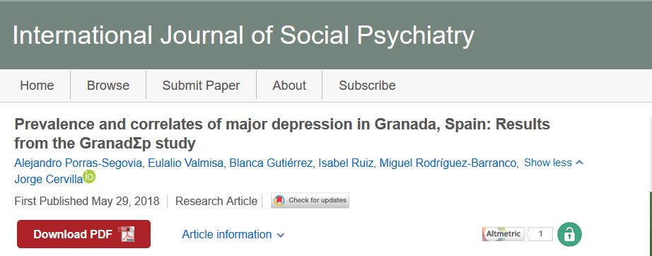 The aim of our study is to report prevalence and correlates of current major depressive disorder (MDD) in the province of Granada, Southern Spain.