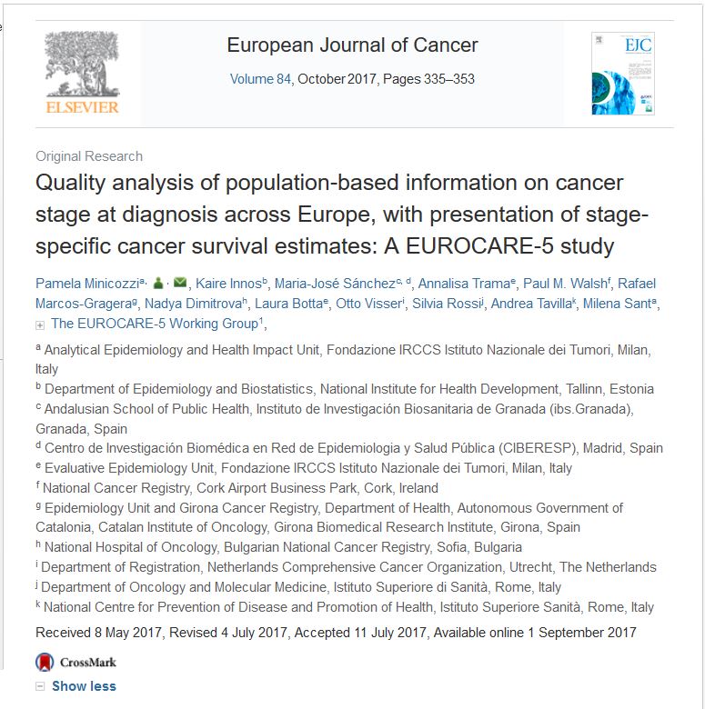 Cancer registries (CRs) are fundamental for estimating cancer burden, evaluating screening and monitoring health service performance. Stage at diagnosis—an essential information item collected by CRs—has been made available, for the first time, by CRs participating in EUROCARE-5. We analysed the quality of this information and estimated stage-specific survival across Europe for CRs with good data quality.