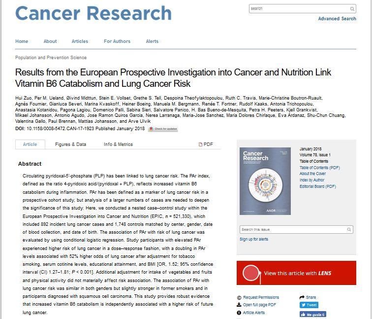 Circulating pyridoxal-5′-phosphate (PLP) has been linked to lung cancer risk. The PAr index, defined as the ratio 4-pyridoxic acid/(pyridoxal + PLP), reflects increased vitamin B6 catabolism during inflammation. PAr has been defined as a marker of lung cancer risk in a prospective cohort study, but analysis of a larger numbers of cases are needed to deepen the significance of this study. Here, we conducted a nested case–control study within the European Prospective Investigation into Cancer and Nutrition (EPIC, n = 521,330), which included 892 incident lung cancer cases and 1,748 controls matched by center, gender, date of blood collection, and date of birth. The association of PAr with risk of lung cancer was evaluated by using conditional logistic regression. Study participants with elevated PAr experienced higher risk of lung cancer in a dose–response fashion, with a doubling in PAr levels associated with 52% higher odds of lung cancer after adjustment for tobacco smoking, serum cotinine levels, educational attainment, and BMI [OR, 1.52; 95% confidence interval (CI) 1.27–1.81; P < 0.001]. Additional adjustment for intake of vegetables and fruits and physical activity did not materially affect risk association. The association of PAr with lung cancer risk was similar in both genders but slightly stronger in former smokers and in participants diagnosed with squamous cell carcinoma. This study provides robust evidence that increased vitamin B6 catabolism is independently associated with a higher risk of future lung cancer.